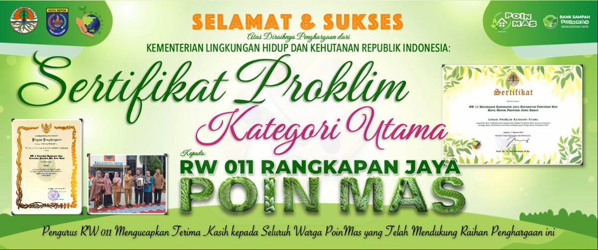 TELEPON PENTING TUTORIAL KLIK KENTONGAN CekIuran SetorSampah Penjelasan Proklim Tanya Jawab Proklim SELAMAT ATAS ANUGRAH KAMPUNG PROKLIM MADYA NASIONAL 2023 dan KAMPUNG PROKLIM UTAMA NASIONAL 2024 KEPADA RW011 KEL.RANGKAPANJAYA DEPOK POIN MAS OLEH KLHK REPUBLIK INDONESIA Pengurus RW011 Pengurus RT
